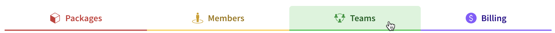 4. On the organization settings page, click Teams. Screenshot of the organization teams tab